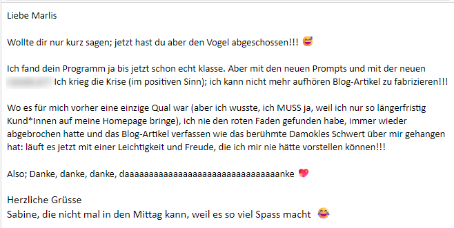 Grundsätzlich steht es dir frei, Texte selbst zu schreiben oder dich von KI helfen zu lassen. Die Prompts im Kurs sind super gut (falls ich das so selbstüberzeugt schreiben darf). Sie helfen zum einen beim Erstellen des Content Funnels, als auch bei der wirkungsvollen Gliederung und auch beim Schreiben in einem natürlichen und menschlichen Schreibstil. Natürlich musst du dennoch schauen, dass alles was KI schreibt, auch inhaltlich stimmt bzw. deine Expertise auch gut getroffen wird. Ich gebe auf jeden Fall Tipps zum richtigen Aufbau der Blogbeiträge. Denn sie funktionieren nur, wenn sie gut aufgebaut sind und auch suchmaschinenoptimiert sind. Ich nutze dafür bestimmte Beitragsframeworks, die klickstark und "magnetisch" funktionieren.